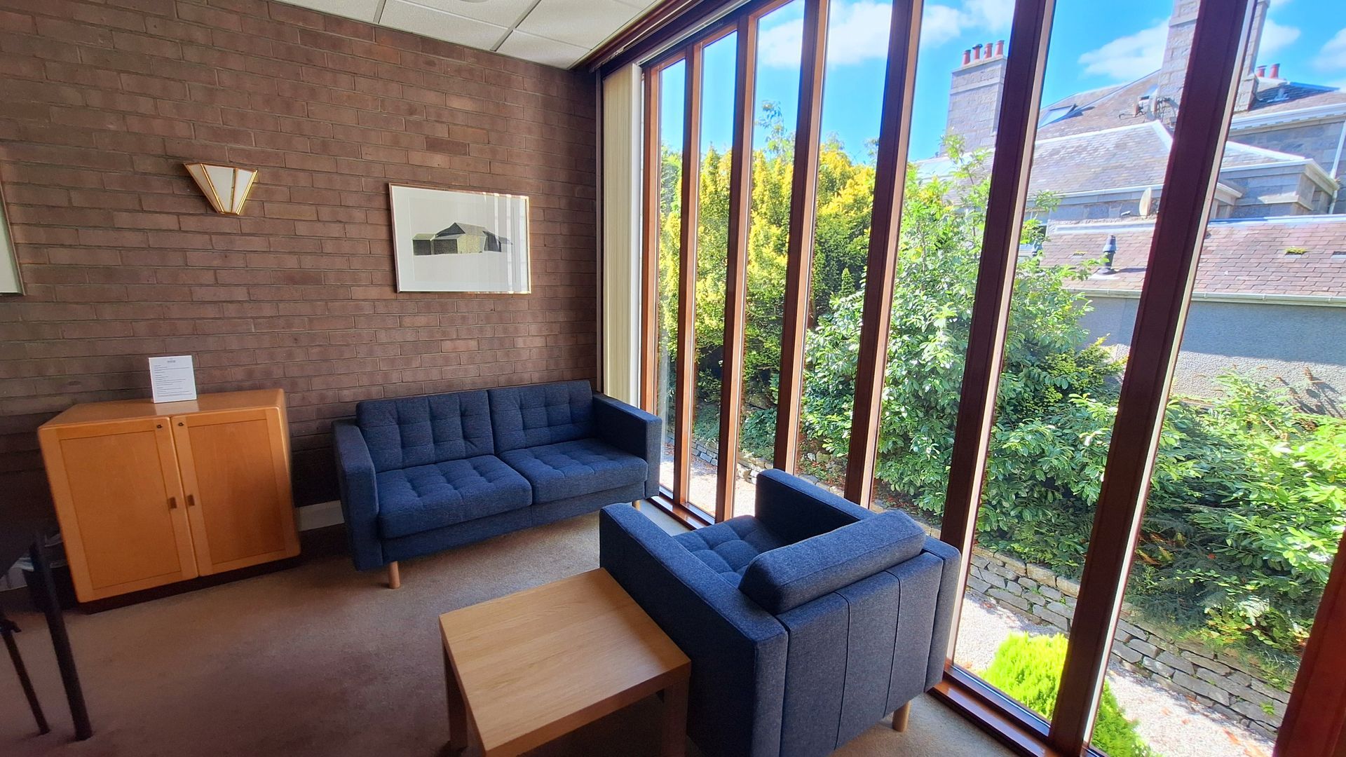 ‘At Rubislaw Den I have space. A 20 square meter four-desk office. Maeghan organised a swift repaint of the room, replaced a heater as requested and we swapped out some furniture as I wished to use my own. Rubislaw Den is a wonderfully quiet location, there’s a calming view over greenery, I have a corner set aside for trauma-based therapy with beanbags, books and games, there’s a consultation area, my work desk and a bed for my support dog Loki.’