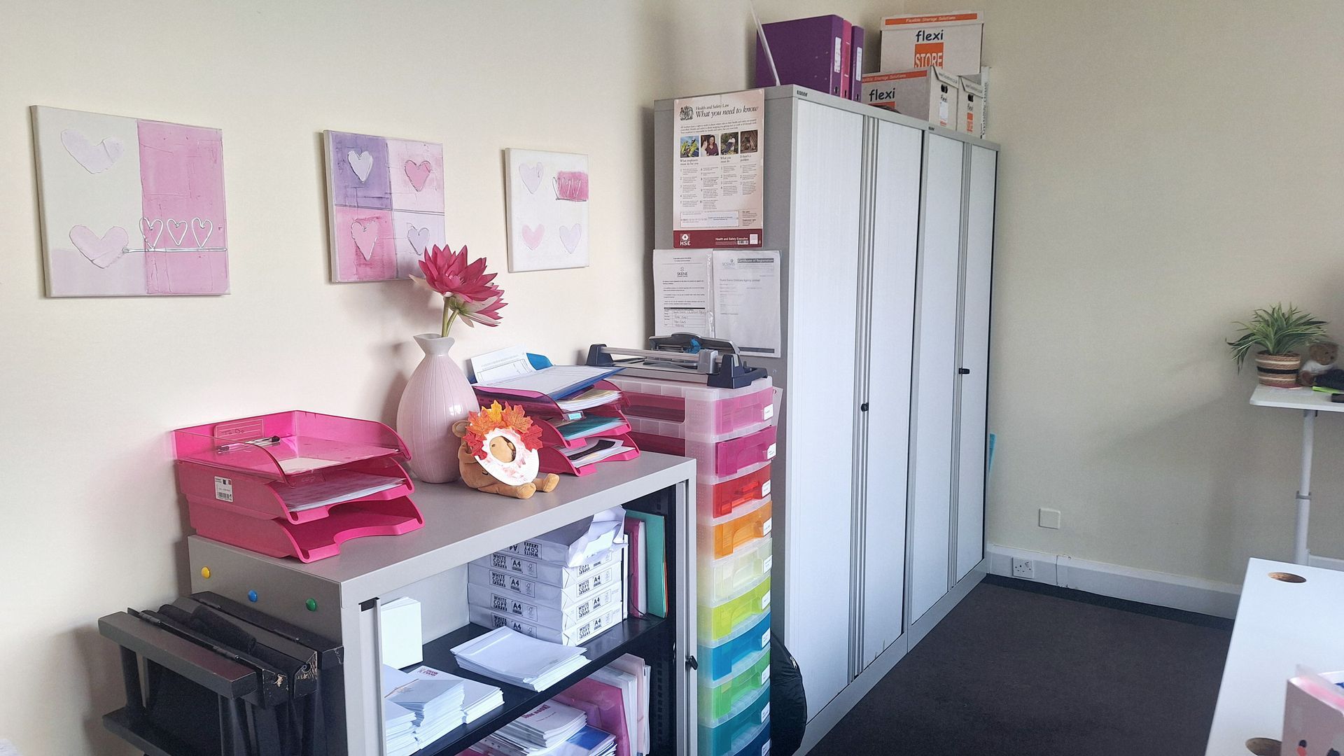 Susan retained the carpets, whiteboard and lighting in her 212 square foot room, providing her own modern office furniture and cabinets, plus she's personalised the space with the occasional potted plant and teddy bear.